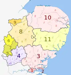 | 3. اسکس | a) هارلو، b) Epping Forest, c) Brentwood, d) Basildon, e) Castle Point, f) Rochford, g) Maldon, h) Chelmsford, i) Uttlesford, j) Braintree, k) Colchester, l) Tendring | ||