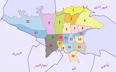 مناطق ۴، ۸، ۱۳ و ۱۴ و ۱۵ در شرق تهران جای دارند و مناطق ۳، ۷ و ۱۲ متمایل به شرق تهران هستند.