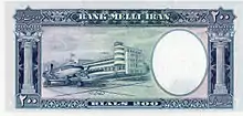 تصویری از ناوگان شرکت هواپیمائی ایران و نمایی از فرودگاه مهرآباد تهران روی اسکناس های قدیمی ایران مربوط به دهه پنجاه میلادی
