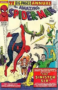 ![]() شش خبیث اصلی (دکتر اختاپوس، الکترو، کراون شکارچی، میستریو، مرد شنی و کرکس) بر روی جلد مرد-عنکبوتی شگفتانگیز سالانه شماره اول (ژانویه ۱۹۶۴)، اثری از استیو دیتکو | |