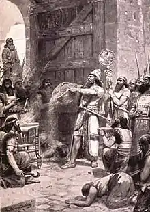 ![]() شلمنسر یکم خاک شهر آریننو را که با جنگ گرفتهاست به پای نیایشگاهی در آشور میریزد. | |