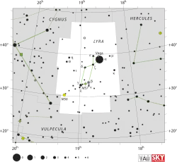 ستاره آلفا یا کرکس نشسته. طیفش A0 V با قدر ۰٫۰۳ و فاصله ۲۶ سال نوری است ستاره بتا تا زمین ۳۰۰ سال نوری فاصله دارد و به عنوان ستارهای از آغازین از گروه متغیرهای گرفتی بهشمار میآید. دو ستارهٔ آن از نوع A۸ و B۷ هستند ستارهٔ بتا دارای قدر متغیر ۳٫۳ تا ۴٫۳ در مدت ۱۲٫۹ ستارهٔ اپسیلون با چشم غیر مسلح با قدر ۴ به نظر میرسد. اما با دوربین دوچشمی به صورت دو ستاره تفکیک میشود تلسکوپهای بهتر هرکدام را به صورت یک جفت جدا از هم تفکیک میکند.