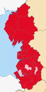 | لانکاشر | 7. لانکاشر † | a) West Lancashire, b) چورلی، c) South Ribble, d) Fylde, e) پرستون، f) Wyre, g) لنکستر، h) Ribble Valley, i) Pendle, j) Burnley, k) Rossendale, l) Hyndburn | |