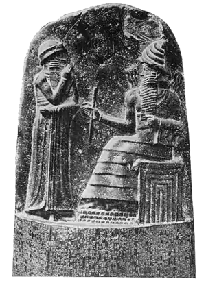 ![]() شمش (نشسته) نمادهای اقتدار را به حمورابی تحویل میدهد؛ سنگبرجستهٔ بالای قانون حمورابی | |