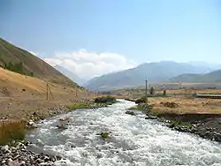 ![]() The Ak-Suu River flowing from the Narzan valley into the south end of Jardy-Suu village. | |