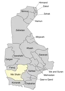 شهرستان نیکشهر دارای ۴ بخش، ۱۱ دهستان و ۴ شهر به شرح زیر است: