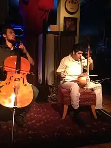 شهریار جمشیدی در حال نواختن کمانچه (راست)