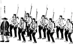 ![]() نیروهای شوگون در حال حرکت به سمت سرکوب شورش میتو در ۱۸۶۴. ![]() یک نقاشی اثر Utagawa Kuniteru III شورشیان میتو طرفدار «سوننو جوای» در زیر پرچم مبارزه با ارتش شوگون تسوکوبا، ایباراکی. | |||||||