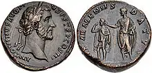 ![]() سکه آنتونینوس پیوس, ضرب شده در رم در تاریخ ca. ۱۴۱ - ۱۴۳. در پشت ، پیوس ایستاده به تصویر کشیده شده که طوماری در دست دارد و دستش را روی سر شوهیموس پادشاه ارمنستان که توسط روم تعیین شده قرار داده است ، که برای تنظیم تاج خود دستش را بالا آورده | |