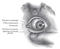 ![]() Front of left eye with eyelids separated to show medial canthus. (Palpebral fissure, visible but not labeled, is artificially widened.) | |