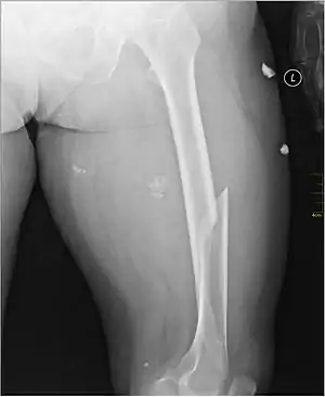 شکستگی معمولاً واضح است، زیرا شکستگی استخوان ران اغلب ناشی از ضربهای با انرژی بالا است.[1] علائم شکستگی شامل تورم، تغییر شکل و کوتاه شدن پا است. آسیب بافت نرم، خونریزی و شوک گسترده است. شایعترین علامت درد شدید است که از حرکت پا جلوگیری می کند.