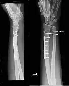 | Galeazzi fracture. Arrow points at the dislocated ulnar head |