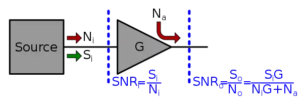 و به فرض سیستمی که دارای یک تقویتکننده تک طبقه نویزی است. نسبت سیگنال به نویز این تقویتکننده شامل خروجی خود میباشد که به نویز، به سیگنال تقویت شده و به نویز ورودی تقویتشده اشاره دارد،