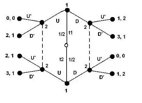 بازی ترسیم شده در زیر همان بازی قسمت قبل است جز آنکه بازیکن ۲ آنچه که بازیکن ۱ در شروع بازی انجام داده است را نمیداند. این بازی با اطلاعات ناکامل است. اگر هر دو بازیکن عقلایی باشند و هر دو بدانند که هر دو عقلایی اند و بازیکنان نسبت به آنچه که بازیکن دیگر میداند آگاهی داشته باشد (یعنی بازیکن ۱ میداند که بازیکن ۲ میداند که بازیکن ۱ عقلایی است و بازیکن ۲ هم این موضوع را میداند و به همین ترتیب تا آخر ادامه پیدا میکند) بازی قبلی به صورت زیر خواهد بود: بازیکن ۱ میداند که اگر او U بازی کند، بازیکن ۲ ’D بازی خواهد کرد (زیرا برای بازیکن ۲، دستاورد ۱ به دستاورد صفر ترجیح دارد) و بنابراین بازیکن ۱، ۲ واحد دریافت میکند. حال اگر بازیکن 1 D بازی کند، بازیکن ۲ ’U بازی میکند (زیرا برای او دستاورد ۲ به دستاورد ۱ ترجیح دارد) و بنابراین بازیکن ۱، ۱ واحد دریافت میکند؛ بنابراین در بازی اول، تعادل (’U,D) خواهد بود زیرا بازیکن ۱، دستاورد ۲ واحدی را به دستاورد ۱ واحدی ترجیح میدهد و در نهایت بازیکن ۱، U و بازیکن ۲، ’D بازی میکند.