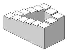 اشیائی که از نظر فیزیکی وجودشان غیرممکن است ولی در نگاه اول فقط عجیب به نظر میرسند. این اشیا در آثار موریس اشر بسیار به کار رفتهاست. بر اثر خطای چشم در دنیای واقعی بعضی از این اشیا ممکن است دیده شوند. ماهیت ناپایدار اشیا غیرممکن به دلیل تمایل ذاتی انسان برای تفسیر تصاویر دو بعدی به عنوان اشیای سهبعدی است و به همین دلیل است که طرحی از یک مکعب نِکِر، تمایل به نشانداده شدن به عنوان یک مکعب را دارد در حالی که در حقیقت ۲ مکعب متصل با کمک خطوط مورب است. تمرکز بر زوایای مختلف یک شیء غیرممکن در فضای سهبعدی باعث تکرار بررسی مجدد آن شیء و سپس گیجشدن ذهن میشود.[1] پلکان پنروز نیز که توسط اسکار ریوتیسفارد ایجاد و بعدها توسط لیونل پنروز و فرزندش راجر پنروز بهطور مستقل ابداع و رواج یافت[2] مثال بارزی از یک شیء غیرممکن است. پلکان پنروز نمای ترسیمی ۲ بعدی از یک پلکان است که پلههایش در حین بالا آمدن یا پایینرفتن، ۴ پاگرد ۹۰ درجه را متحمل میشوند که همین موضوع مسبب یک چرخهٔ پیوسته و بیانتها است.