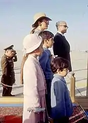 شهبانو فرح پهلوی در حال گفتگو با فرزانه تأییدی، علی نصیریان، عزتالله انتظامی و مهین شهابی در جشن هنر شیراز