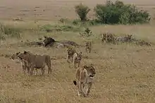مهاجران: این گروه گستره بیشتری برای زندگی انتخاب میکنند و به صورت تکی یا دوتایی در حرکتند.[106] جفتشدن گروهی از سوی نرهای بالغی که از گروه مادری خود بیرون انداخته شدهاند معمولتر است. شیرها میتوانند وضعیت زندگی خود را از مهاجر به مقیم و بالعکس تغییر دهند. گاه نرها در طول زندگی نمیتوانند وارد هیچ گلهای شوند. مادههای مهاجر اما برای مقیم شدن مشکل سختتری دارند و آن پذیرفته نشدنشان از سوی مادههای گله مقیم است که جلوی پیوستن آنها به گله را میگیرد. منطقهای که توسط یک گله اشغال میشود اغلب قلمرو خوانده میشود.[106] قلمرو این جانوران میتواند در گستردهترین حالت تا ۲۶۰ کیلومتر مربع را پوشش دهد.[107]