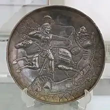 - «نقش شکار شیر و مفاهیم نهفته در آن بر روی بشقاب نقره ساسانی». ساسانیان. دریافتشده در ۱۳ مارس ۲۰۲۱.