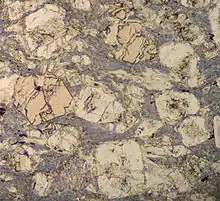 - پلیتها: کارفولیت آهن و منیزیم دار+/- کلریتوئید+/- کیانیت+ زوئیزیت+/- پارگازیت یا فنژیت+/- آلبیت+/- کوارتز+/- تالک+/- گارنت