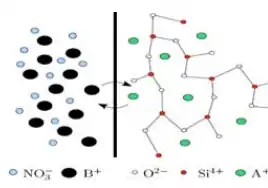 تعویض یونی بدین صورت میباشد،اصل این روش ساده است که در آن یون (A +) مرتبط با یک ماتریس شیشه ای جامد (X -)توسط یون دیگری(B +) با همان ظرفیت در نمک مذاب جایگزین میشود. که مکانیزم تعویض یونی صورت گرفته بصورت معادله زیر است: