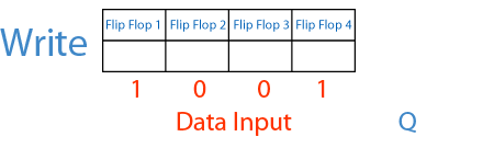 مدار بالا دارای ورودی داده به صورت موازی روی خط ۱ تا ۴ میباشد. برای نوشتن دیتا تو رجیستر خط کنترل (شیفت / نوشتن) باید صفر نگه داشته شود. برای انتقال داده خط کنترل ۱ میشود و ثباتها زمانبندی میشوند. با این ترتیب مدار با ورودی ۱ به صورت ورودی، اکنون به صورت یک شیفت رجیستر با ورودی سریال و خروجی سریال عمل میکند. به هر حال تعداد سیگنالهای ساعت بیشتر از طول رشته داده نمیباشد.