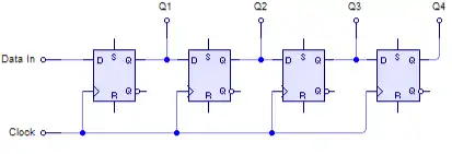 اینها سادهترین نمونه از شیفت رجیسترها میباشند. رشتهای از دادهها در ورودی قرارمیگیرد و هروقت که کلاک ۱ باشد یک مرحله به راست تغییر مکان میدهد. بیتی که در چپترین قسمت دارد به خروجی اولین فلیپ فلاپ منتقل میشود. بیتی که در سمت راستترین قرار دارد (خروجی آخرین فلیپ فلاپ) به خروجی منتقل میشود و از بین میرود. داده بعد از هر فلیپ فلاپ روی خروجی ذخیره میشود؛ بنابراین ۴ واحد ذخیرهسازی در این شکل وجود دارد که آن یک شیفت رجیستر ۴ بیتی میباشد. برای درک بهتر الگوی جابجایی تصور کنید که رجیستر عدد باینری ۰۰۰۰ را در خود نگه میدارد (بنابراین همه واحدهای ذخیرهسازی خالی میباشند). مانند دیتای ورودی برای رجیستر ۱٬۰٬۱٬۱٬۰٬۰٬۰٬۰ میباشد؛ بنابراین خروجی سریال کل رجیستر ۱۰۱۱۰۰۰۰ میباشد. اگر ورود دیتا به ورودی ادامه پیدا کند در خروجی دقیقاً مانند داده ورودی دیده میشود. این مانند یک صف میباشد. همچنین در هر زمانی کل رجیستر میتواند با صفر کردن پایه ریست، صفر شود.