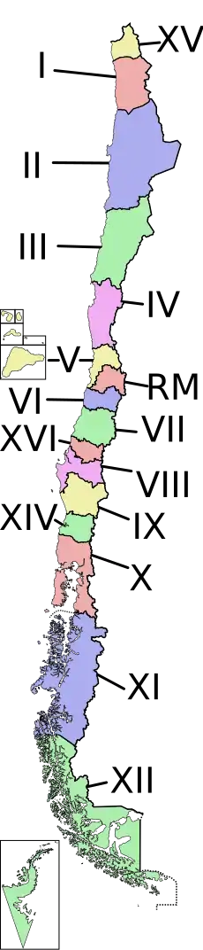 شیلی به ۱۵ منطقه تقسیم میشود، که هریک تحت ریاست مدیر منصوب شده از سوی رئیسجمهوری اداره میشود. هر ناحیه نیز به استانهایی با فرمانداران استانی تقسیم میشود، که فرمانداران نیز توسط رئیسجمهور تعیین میگردند. نهایتاً هر استان به شهرداریهایی تقسیم میگردد،[7] که اغلب به شهرداریها عنوان کمونا را نسبت میدهند و هر شهرداری یک شهردار و چند مشاور برای خود دارد، که به عنوان "concejales" از سوی ساکنان آن نقاط انتخاب میشوند.
