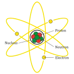 اتم از یک هسته مرکزی با بار مثبت محاطه شده با ابر الکترونی با بار منفی تشکیل شدهاست. تعریف دیگری آن را به عنوان کوچکترین واحدی در نظر میگیرد که ماده را میتوان به آن تقسیم کرد بدون اینکه اجزاء بارداری از آن خارج شود.[11] اتم ابری الکترونی، تشکیلشده از الکترونها با بار الکتریکی منفی، که هستهٔ اتم را احاطه کردهاست. هسته نیز خود از پروتون که دارای بار مثبت است و نوترون که از لحاظ الکتریکی خنثی است تشکیل شدهاست. زمانی که تعداد پروتونها و الکترونهای اتم با هم برابر هستند اتم از نظر الکتریکی در حالت خنثی یا متعادل قرار دارد در غیر این صورت آن را یون مینامند که میتواند دارای بار الکتریکی مثبت یا منفی باشد. اتمها با توجه به تعداد پروتونها و نوترونهای آنها طبقهبندی میشوند. تعداد پروتونهای اتم مشخصکننده نوع عنصر شیمیایی و تعداد نوترونها مشخصکننده ایزوتوپ عنصر است.[12]