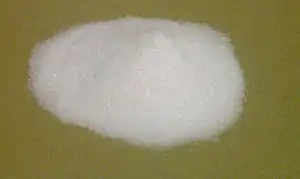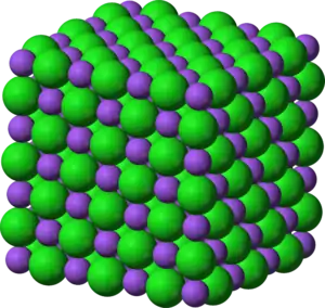 | نمونههایی از مواد شیمیایی خالص از چپ به راست: عناصر قلع (Sn) و گوگرد (S), الماس (به عنوان دگرشکلی از کربن), ساکارز (شکر خالص), و سدیم کلرید (نمک) و بیکربنات سدیم (جوش شیرین), که ترکیبات یونی هستند. |