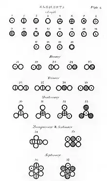 | ۱۸۰۸ | جان دالتون سیستم جدید فلسفه شیمیایی را منتشر میکند، که شامل اولین توصیف علمی مدرن نظریه اتمی و شرح روشنی از قانون نسبتهای چندگانه است.[62] | ||