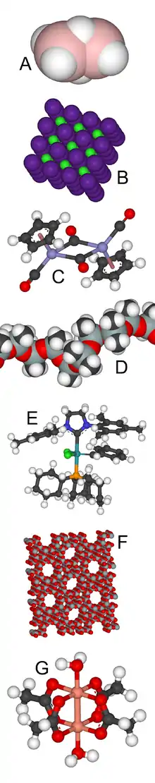 ترکیبات مولکولی: این ترکیبات ممکن است جامد، مایع یا گاز باشند و مثالهای زیر را دربر میگیرند: