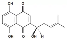 شیکونین (به انگلیسی: shikonin) یک متابولیت ثانویه گیاهی است که دارای خواص داروئی قابل توجهی از جمله اثر ضد سرطان، ضد میکروب، ضد التهاب، بهبود زخم و ضد دیابت است.[1] شیکونین و مشتقات آن رنگدانههای قرمز رنگ از گروه نفتوکوئینونها هستند که در ریشه بسیاری از گونههای خانواده بوراژیناسه (Boraginaceae) شامل erythrorhizon ,Lithospermum Arnebia ,Onosma ,Alkanna ,Anchusa و Echium تجمع مییابند.[2] از آنجا که محل تجمع این رنگیزهها در بخش پوست ریشه میباشد، ریشههای این گیاهان به رنگ قرمز بنفش است. اگر شیکونین از بافتهای تازه استخراج شود، به تدریج طی چند روز تیره میشود و در نهایت تبدیل به رسوب سیاهی میگردد که تصور میشود پلیمر باشند.[3] خانواده بوراژیناسه اغلب گیاهان علفی چند ساله هستند و شامل حدود ۱۰۰ جنس و ۲۰۰۰ گونه است که در مناطق معتدل و گرمسیری توزیع شدهاند. متابولیتهای ثانویه مهم این خانواده آلکالوئیدها، نفتوکوئینونها، پلی فنولها، فیتواسترولها، ترپنوئیدها و اسیدهای چرب میباشد.[4] بهطورکلی متابولیتهای ثانویه گیاهان به سه گروه اصلی پلی فنولها، آلکالوئیدها و ترپنها دستهبندی میشوند. نفتوکوئینونها متعلق به دسته پلی فنولها میباشند که شیکونین و مشتقهای آن دارای بیشترین اهمیت تجاری در بین رنگدانههای نفتوکوئینون هستند.[2] شیکونین دارای خاصیت چربی دوستی بالایی است و در درجه حرارت بالا ناپایدار میباشد و تمایل به اکسید شدن و پلی مریزه شدن دارد.[5]