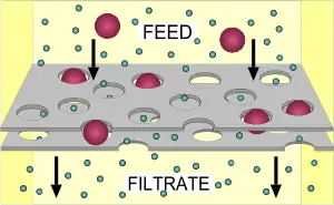 طرحی ساده از یک فرایند فیلتراسیون که در آن ذرات بزرگ جامد در خوراک ورودی دیده میشوند که به دلیل اندازه بزرگ قادر به عبور از غشاء نیستند و در عوض ذرات سیال به سادگی از غشاء عبور میکنند.