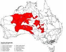 نقشهٔ نشانگر بیابانهای استرالیا که اغلب آنها در فلات غربی استرالیا قرار دارند