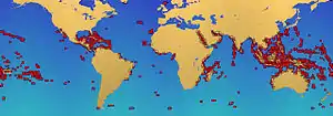 - بیش از ۱۰۰۰۰۰ کیلومتر از حاشیه کشورهای استوایی توسط صخرههای مرجانی پوشیده شدهاست. در حقیقت بسیاری از جزایر مرجانی و آتولها، تنها به خاطر فرایند ساخته شدن صخرههای آبی وجود دارند. آنها تقریباً ۶۰۰۰۰۰ کیلومتر مربع یا ۰٫۱ درصد از سطح زمین را میپوشاند. مرجانهای سازنده صخرههای آبی، آبهای کم عمق تمیز و جاذب نور خورشید را ترجیح میدهند که درجه حرارت آن بین ۲۰ تا ۳۰ درجه سانتیگراد باشد. آنها در آبهایی که خنکتر از ۱۶ درجه سانتیگراد باشند، رشد نمیکنند. مرجانها تا عمق ۳۷ متری رشد میکنند. پایینتر از این عمق، نور کافی برای جلبکها که غذای مرجانها را تشکیل میدهند وجود ندارد.
