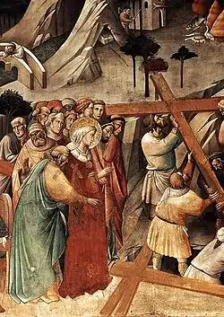 آن گاه که هلن ( سینت هلنا )، مادر کنستانتین کبیر به زیارت اورشلیم رفت، به درخواست وی جایی (تپه جُلجُتا) را که عیسی به دار زده شده بود، کاوش کردند و سه چلیپا یافتند زیرا آنچنان که در انجیل آمده برای اینکه به عیسی توهین شده باشد، او را میان دو دزد بدار زدند. برای اینکه دار خود عیسی مشخص شود، زن بیماری را که در آستانهٔ مرگ بود، سایهای از آن سه چلیپا بر روی او انداختند، از سایه چلیپایی که او بهبودی یافت، دانستند که آن چوبهٔ چلیپا از آن عیسی است.