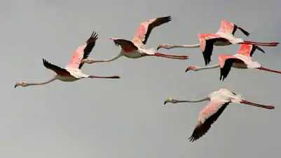فلامینگوهای بزرگ در حال پرواز بر فراز دریاچه Pocharam در آندرا پرادش ، هند.