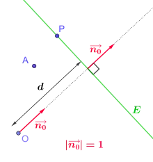 نقطه. نشانگر ضرب داخلی یا ضرب اسکالار است و بردار نشانگر بردار واحد یا است که از مبدأ مختصاتی به سمت صفحه یا نقطهٔ مورد نظر کشیده شدهاست. مقدار d که بزرگتر از صفر است به فاصلهٔ خط یا صفحه از مبدأ مختصاتی اشاره دارد.
