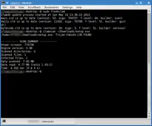 ![]() کلم ایوی ۰٫۹۶، اجرای آپدیت مشخص، اسکن یک فایل و شناسایی یک تروجان از خط فرمان. | |
