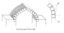- ضربی زخم یا پُر. در این شیوه آجر یا خشت از پهلو که پهنترین بخش است به یکدیگر میچسبد؛ حالت چینش آجر یا خشت به شکل «نَر» (پهنا ایستاده) است. از آنجا که در این شیوه محل چسبیدن رجها که پهنای آجر یا خشت است عمودیست و به اصطلاح رجها «هَج» (عمود) ایستادهاند، رجها برای چسبیدن پهلو به پهلو به یکدیگر میباید به شکل افقی پیش بیایند. اینگونه که تنها دو سر هر رج روی دیوار دو سوی دهانه قرار گرفته و آنگاه همانطور که از نام «ضربی» پیداست هر آجر یا خشت ملاط اندود با ضرب به پهلوی آجر رج پیشین چسبانده میشود. بدیهی است که در این روش رج نخست برای سرپا ماندن نیاز به تکیهگاهی جدای از دو دیوار دو سوی دهانه که تنها با دو سر رج تماس دارند دارد؛ این تکیهگاه یک عضو سومی است که برای پیاده کردن طاق ضربی ناگزیر است و آن یا دیواری دیگر به نام دیوار اِسپَر است که در شیوه طاق آهنگ با بافت ضربی کارایی دارد یا تویزه ایست که روی دهانه گذاشته یا ساخته میشود تا طاق ضربی بر آن تکیه دهد. این شکل را در شیوه طاق تویزه میتوان یافت. با این همه در بافتار ضربی روشهای دیگری هم هست که اگرچه در کلیت همانندند، اما جزئیات و ظرائفی متفاوت دارند. برای نمونه و بهطور ویژه در طاق آهنگ به روش ضربی معمولاً استادکار رازیگر رج نخست را با اندکی میل به سمت دیوار اسپر و به حالت اُریب میچیند که در این صورت باقی رجها نیز با همین زاویهٔ میل و اریب چیده شده و بافت در پایان اریب وار یکدست میشود. این کار را استادکار برای مهار کردن و توزین بهتر سنگینی بار رجها و اینکه با کمتر کردن وزن آجر و خشت به هنگام چیدن فرصت بیشتری به ملاط داده شود تا خود را بگیرد انجام میدهد.[8]