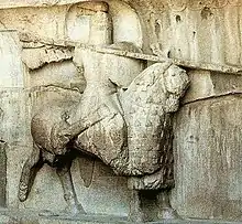 در زیر نقش تاجگذاری خسرو پرویز سواری زرهپوش سوار بر اسب قرار دارد.