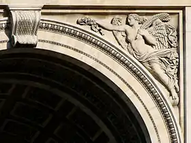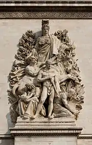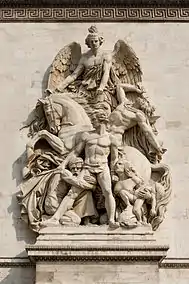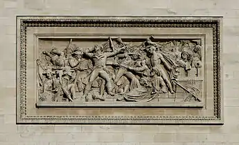 - Le Départ de 1792 (or La Marseillaise), by François Rude. The sculptural group celebrates the cause of the French First Republic during the 10 August uprising. Above the volunteers is the winged personification of Liberty. This group served as a recruitment tool in the early months of World War I and encouraged the French to invest in war loans in 1915–16.[8]