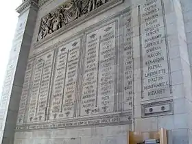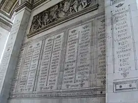 - On the inner façades of the small arches are engraved the names of the military leaders of the French Revolution and Empire. The names of those who died on the battlefield are underlined.