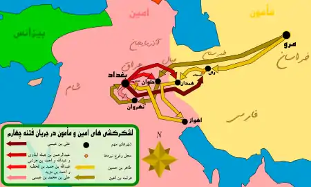 - امارت همدان تا مرزهای شرقی خلافت را به عبداللهمأمون بخشید و او را، به عنوان جانشین امین، در مرو مستقر کرد.
