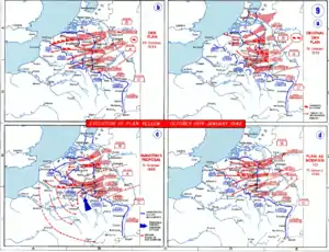 ![]() عکس عقربههای ساعت از بالا سمت راست : تکامل طرحها آلمانی: Fall Gelb (Case Yellow), برای اشغال فرانسه و کشورهای کشورهای سفلی | |