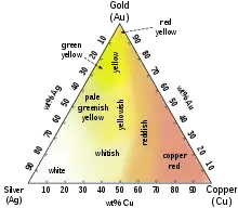 آلیاژهای رنگی طلا مانند طلای قرمز را میتوان با افزودن اندکی مس و نقره بدست آورد. مثلث کناری رنگهای گوناگون آلیاژهای نقره-طلا-مس را نشان میدهد. آلیاژهای دیگر طلا مانند نیکل و پالادیم هم در گوهرسازی تجاری مهم اند چون با کمک آنها به آلیاژ طلای سفید دست مییابیم. افزودنیهای دیگر مانند منگنز، آلومینیم، آهن، ایندیم و… میتوانند رنگهای دیگری از طلا بدست آوردند که چندان معمول نیست و کاربردهای دیگری دارد.[8]