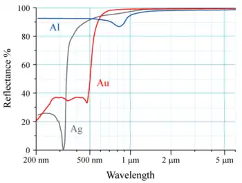 - چون طلا یک بازتابندهٔ خوب پرتوهای الکترومغناطیسی مانند فروسرخ، نور دیدنی و موجهای رادیویی است. به عنوان پوشش محافظ بسیاری ماهوارهها به کار میآید. همچنین در صفحههای محافظ فروسرخ در لباسهای مقاوم در برابر گرما، کلاه لباسهای فضانوردی و در هواپیماهای جنگ الکترونیک مورد نیاز است.