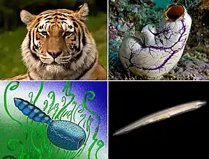 | Example of chordates of four subphyla of lower rank: a Siberian Tiger (Vertebrata) and a Polycarpa aurata (Tunicata), two Olfactores, as well as Ooedigera peeli (Vetulicolia) and a Branchiostoma lanceolatum (Cephalochordata). | |
