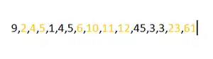 زیر رشتهٔ بالا طولی برابر ۶ دارد و در رشته اصلی داده شده هیچ زیر رشتهٔ صعودی به طول۷ وجود ندارد. طولانیترین زیر رشتهٔ صعودی یکتا نیست برای مثال در رشتهٔ داده شده یک زیر رشتهٔ صعودی دیگر به طول ۶ در زیر آورده شدهاست.