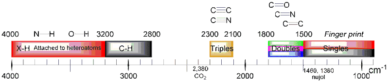 C=O کششی در کلر ور اسیدهای غیر مزدوج در محدوده cm−1۱۷۷۵ – ۱۸۱۰ یافت میشود. مزدوج شدن، باعث کاهش فرکانس تا cm−1 ۱۷۶۰ – ۱۷۸۰ میگردد. ظهور دو نوار قوی در ناحیه cm−1 ۱۸۳۰ – ۱۸۰۰ و cm−1 ۱۷۷۵–۱۷۴۰ از مشخصات انیدریدهای اشباع شده و غیر حلقوی است. این دو نوار حاصل ارتعاشات کششی نا متقارن و متقارن است. مزدوج شدن جذب را به طرف راست برده، در حالی که حلقوی شدن آن را به چپ منتقل میسازد. ارتعاش کششی قوی و پهن C – O در ناحیه cm−1 ۱۳۰۰ – ۹۰۰ ظاهر میگردد. N–H کششی در ناحیه cm−1۳۵۰۰ – ۳۳۰۰ ظاهر میشود. آمینهای نوع اول دو نوار و آمینهای نوع دوم یک نوار دارند. آمینهای نوع سوم N–H کششی ندارند.N–H خمشی در آمینهای نوع اول به صورت نوار پهن در cm−1 ۱۵۶۰ – ۱۶۴۰ ظاهر میگردد. آمینهای نوع دوم در نزدیکی cm−1 ۱۵۰۰ جذب میدهند. N–H جذب خمشی خارج از صفحهای گاهی در نزدیکی cm−1۸۰۰ مشاهده میشود. N–C کششی در ناحیه cm−1۱۳۵۰۰ – ۱۰۰۰ ظاهر میگردد.